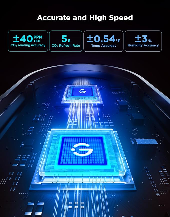 - Fast & Accurate: This CO₂ monitor boasts an accuracy of ±(40ppm + 5%), a fast 5s refresh rate, and a built-in air pressure sensor, ensuring reliable performance at any altitude. It helps prevent headaches and drowsiness while improving sleep quality and enhancing concentration.
