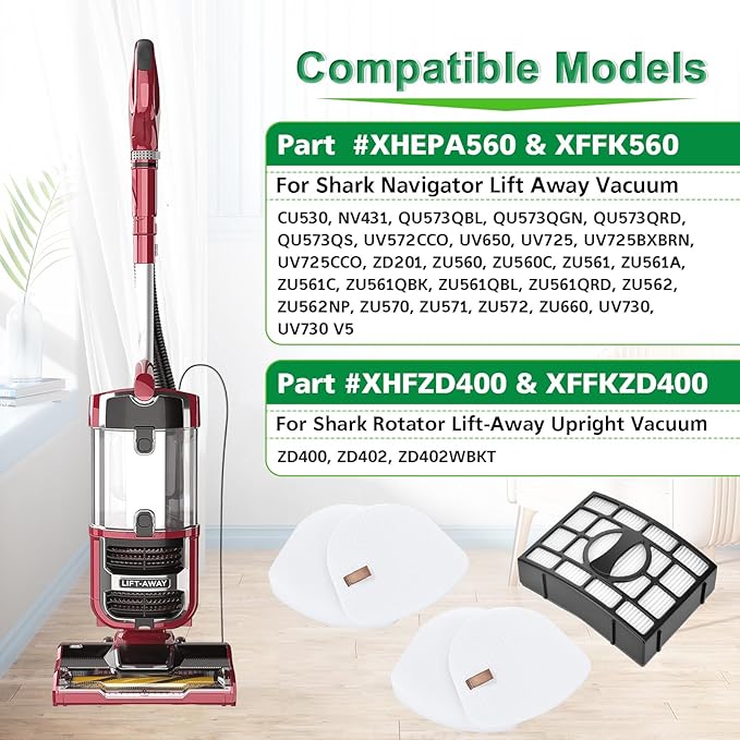 - COMPATIBILITY: These vacuum filter replacement fit for Shark Navigator ZU560, ZU560C, ZU561, ZU561A, ZU561C, ZU561QBK, ZU561QBL, ZU561QRD, ZU562, ZU562NP, ZU570, ZU571, ZU572, ZU660, CU530, NV431, QU573QBL, QU573QGN, QU573QRD, QU573QS, UV572CCO, UV650, UV725, UV725BXBRN, UV725CCO, ZD201, UV730, UV730 V5 Rotator ZD400, ZD402, ZD402WBKT Lift Away Upright vacuum. Part XFFK560 & XHEPA560, XFFKZD400 & XHFZD400