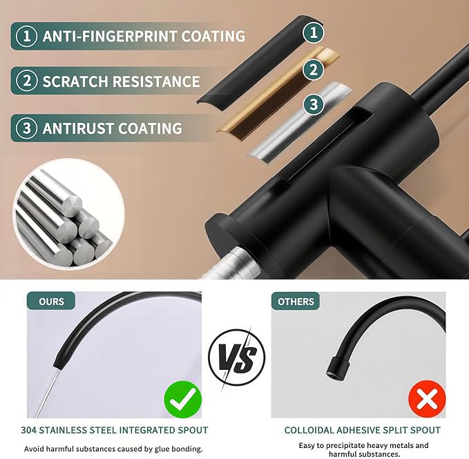 - ▶【INTEGRATED SPOUT】Our water filter sink faucet use integra spout, avoid harmful substances caused by glue bonding. Other drinking water filter faucet is colloidal adhesive split spout, Easy to precipitate heavy metals and harmful substances.