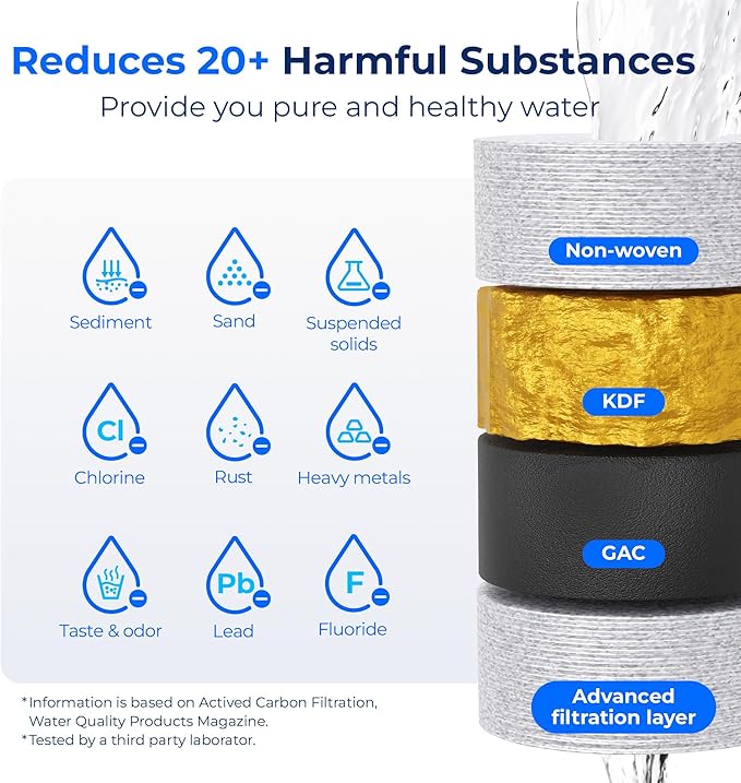 - 【SUPERIOR PERFORMANCE】: Highly efficient multi-stage filtration with the use of Kinetic Degradation Fluxion (KDF) and Advanced Granular Activated Carbon (GAC) technology. Delivers cleaner and safer drinking water by reducing Chlorine, Bad Taste&Odor.