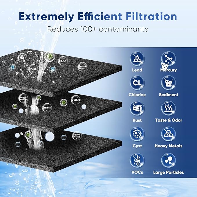 - ❄️ Authoritative Certifications - The filter is certified by NSF/ANSI 53, 42 for reducing chlorine, taste, and odor, and NSF/ANSI/CAN 372 for lead-free compliance. It removes heavy metal, 97.5% of Chlorine, 99.6% of Lead, 89.3% of Mercury and significantly improving water taste. It is also certified by REACH, Canadian CSA, BPA Free and Australian Water Mark. Only select products with authoritative certifications for your households.