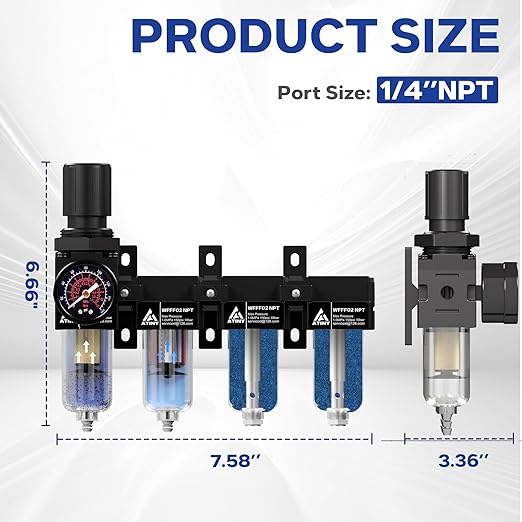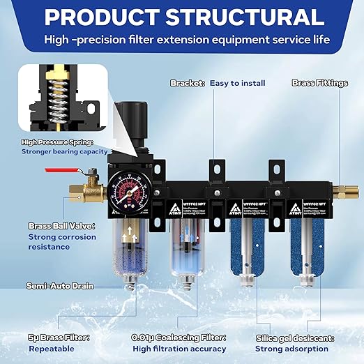 - 【Stage 1 Regulator & Filter】The primary filtration adopts 5 micron brass filter element, which can filter 98.63% of the impurities oil and water in the air, and the brass filter element can be disassembled and cleaned for reuse, which saves your cost.