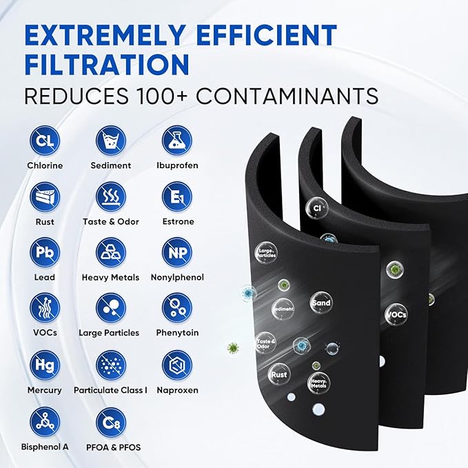 - ❄️Innovative Multi - Layer Filtration Integrated Molding Tech - This Multi-layer technology offers different levels of filtration efficiency in filtering out different particles. The 0.5 Micron inner layer is effective against 99.99% of Chlorine and meets Particular Reduction Class I standards. This filter retains beneficial minerals in water which is good for your health.