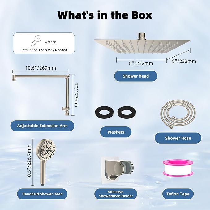 - Easy to Install, No Plumbing Needed: Experience the convenience of our DIY-friendly shower set with US standard 1/2'' pipe threads. No need for a plumber or handyman; install your new shower head in minutes. The rainfall shower head with handheld combo includes a 8-inch large square shower head, a 10 spray handheld shower head, a 71-inch metal stainless steel shower hose, a 16-inch shower head extension arm, an adhesive shower head holder, washers, Teflon tape, and an installation manual