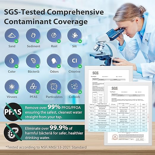 - Comprehensive 2-Stage Protection - The first stage targets PFAS, chlorine, odors, and particulates, while the second stage focuses on eliminating Báctérïa, viruses, and additional contaminants, ensuring safe and great-tasting water.
