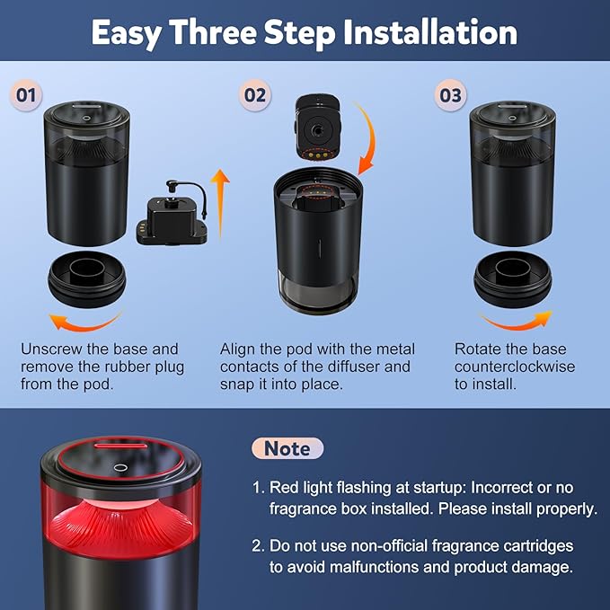 - ****Troubleshooting - Red light flashes: The car fragrance box is not installed correctly and the battery is low. Please install the aromatherapy box correctly according to the instructions and charge it in time.