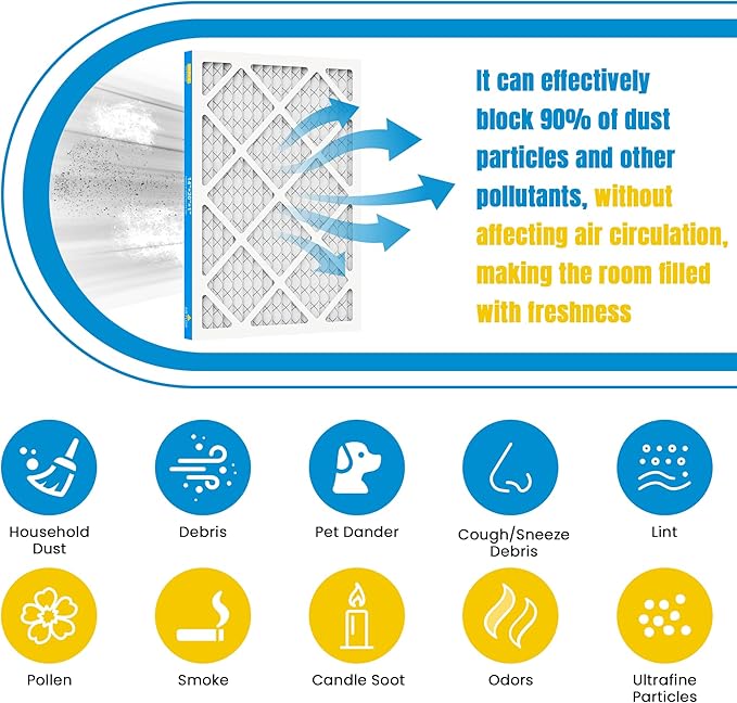- 【MERV 8 Rated Filtration】Provides effective basic protection by capturing common airborne pollutants.Efficiently traps dust, pollen, pet dander,and other large particles (3-10 microns) to improve indoor air quality and safeguard your family's respiratory health