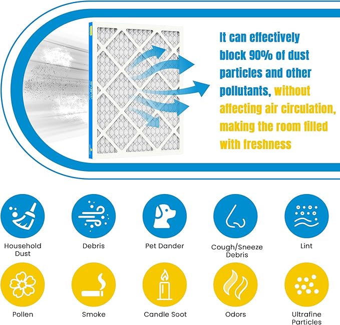 - 【MERV 8 Rated Filtration】Provides effective basic protection by capturing common airborne pollutants.Efficiently traps dust, pollen, pet dander,and other large particles (3-10 microns) to improve indoor air quality and safeguard your family's respiratory health