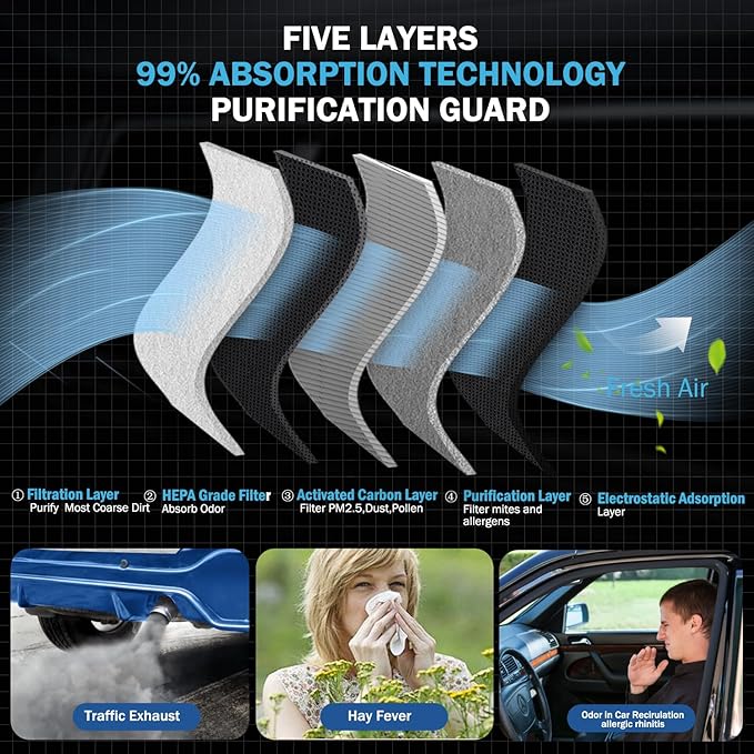 - Five-Layer Air Filtration Performance: We adopt five-layer construction with dual HEPA layer captures 99.9% of particles, specifically designed to prevent exhaust fumes and dirty for noticeably cleaner cabin air and upgraded efficiency compared to standard factory filters