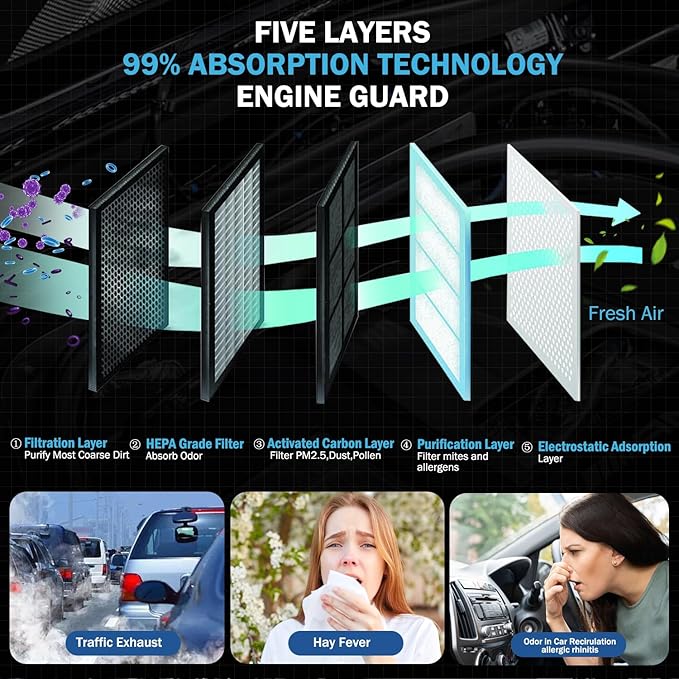 - Five-Layer Air Filtration Performance: For the engine air filter, we adopt five-layer construction with HV filter captures 99.9% of impurities, such as hair, fines, dust and flocs for noticeably cleaner engine. The engine can be more powerful after high efficiency filtration. For the cabin air filter, We adopt five-layer construction with dual HEPA layer captures 99.9% of particles, specifically designed to prevent exhaust fumes and dirty for noticeably cleaner cabin air and upgraded filtration efficiency compared to standard factory filters. Both are upgraded filtration efficiency compared to standard factory filters