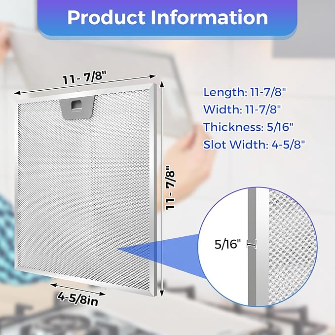 - Product dimensions: 11 7/8" x 11 7/8" x 3/8" — Please confirm compatibility with your range hood before purchasing.