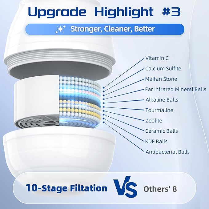 - 【10-STAGE GRANULAR CORE FILTRATION】Our upgraded filter combines 10 active layers—KDF-55, Vitamin C, Tourmaline, Zeolite, Ceramic Balls and more—to remove up to 99% of chlorine, fluoride, rust, and other impurities. Cleaner, safer bath water for the whole family.