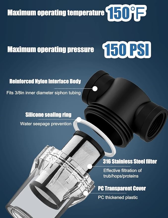 - BUILT TOUGH FOR USAGE DESIGN: Made from heavy-duty plastic, our beer filtering systemcan withstand repeated use. Unlike other wine filters for sediment, our it’s lightweight yet rugged enough to handle hot wort (up to 150°f!) and high-pressure setups. Bonus: The 150 mesh strainer won’t clog mid-batch, so you spend less time scrubbing and more time sipping.