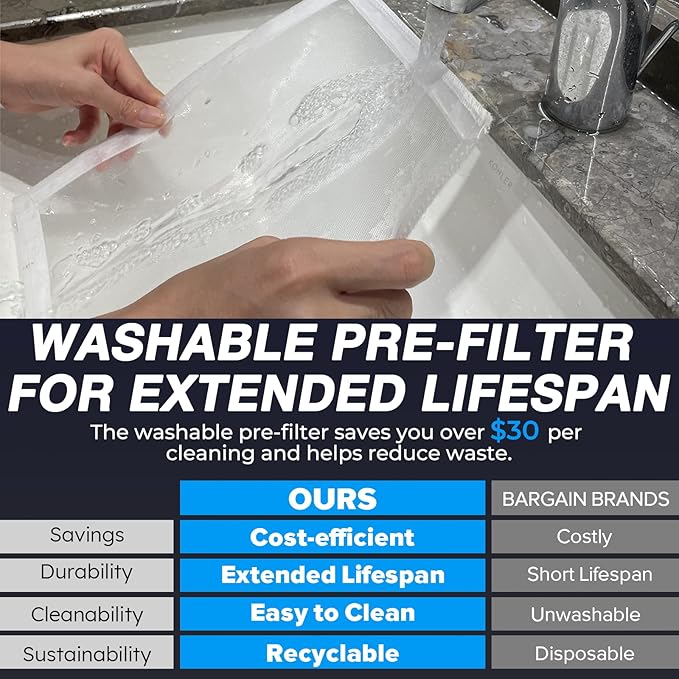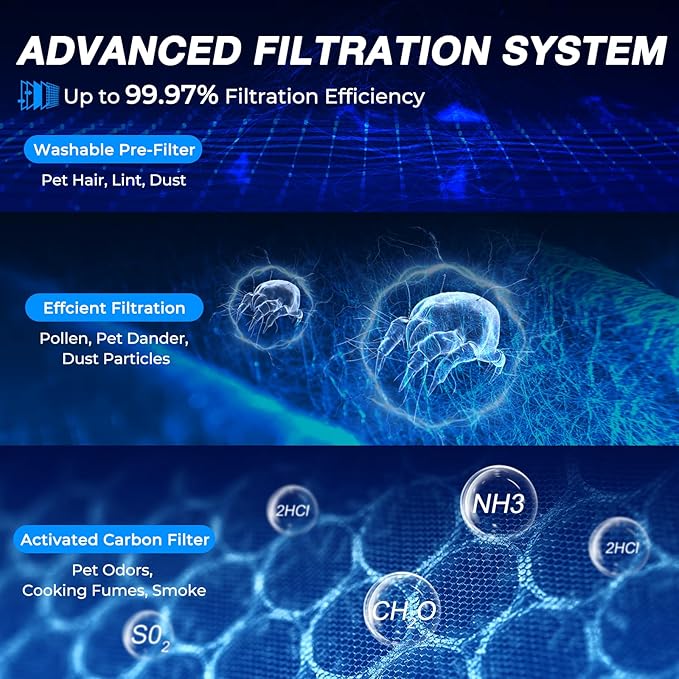 - ADVANCED MULTI-LAYER FILTRATION: This air purifier for the home uses a comprehensive multi-stage system—including a washable pre-filter, a high-efficiency filter, and an activated carbon layer—to help capture common airborne particles such as pet hair, dust, pollen, and cooking smoke. The washable pre-filter can help extend the life of the main filter, potentially reducing replacement costs. The air purifier system is designed to provide consistently fresh and comfortable air for your family