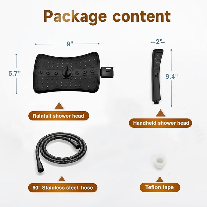 - Rain shower heads combo is packaged in a strong box, perfect as a gift to friends. Package includes: 1*Rain shower head, 1*Handheld shower, 1*60 Inches stainless steel shower hose, 1*Teflon thread seal tape. Please note washers are pre-assembled, no shower arm included in the packaging.
