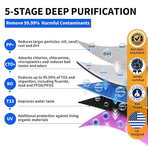 - Pure Water Near 0 TDS – Experience unmatched purity with our reverse osmosis water filter under sink. Engineered to reduce Total Dissolved Solids (TDS) to near 0 PPM, it delivers crystal-clear water free of impurities. Enjoy safe, clean, and pure water for drinking, cooking, and more—because your health deserves the best.
