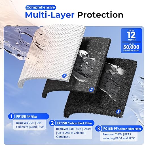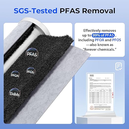 - PFAS-Free Water for Your Whole Home – Built with an SGS-tested FC15B-PF PFAS-removal filter, this compact whole house water filtration system removes up to 99% of PFAS, including PFOA and PFOS, found in municipal and well water. A reliable PFAS water filter for families seeking safer water throughout the home.