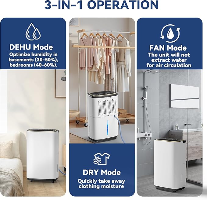 - 【3-in-1 Smart Dryness & Care】 This versatile dehumidifier combines three functions in one: control humidity (30%-80% adjustable), quickly dry laundry, or circulate fresh air. The display shows real-time humidity (20%-90% range), while dual fan speeds let you customize power for any need—from gentle drying to rapid moisture removal.