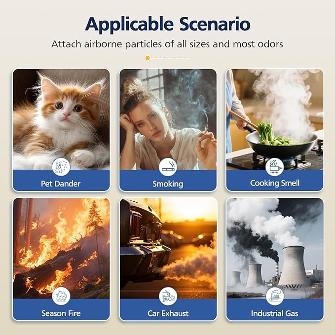 - HIGH EFFICIENCY: The 240 and Hepa 14 filter works for 99.97% of the airborne substance as small as 0.3 microns such as dust, hairs, pet fur, lint, pollen, pet dander. The high-efficiency activated carbon filter with 60% more activated carbon and unique ARC Formula can decomposes 99% of unpleasant household odors like wildfires gases, cigarettes, car exhaust, pet odors, chemical odors.