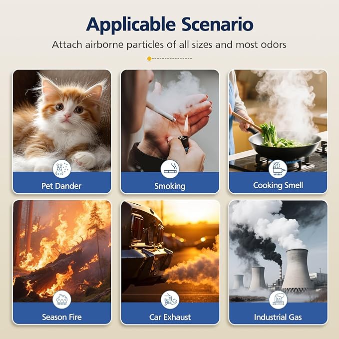 - HIGH EFFICIENCY: The 240 and Hepa 14 filter works for 99.97% of the airborne substance as small as 0.3 microns such as dust, hairs, pet fur, lint, pollen, pet dander. The high-efficiency activated carbon filter with 60% more activated carbon and unique ARC Formula can decomposes 99% of unpleasant household odors like wildfires gases, cigarettes, car exhaust, pet odors, chemical odors.